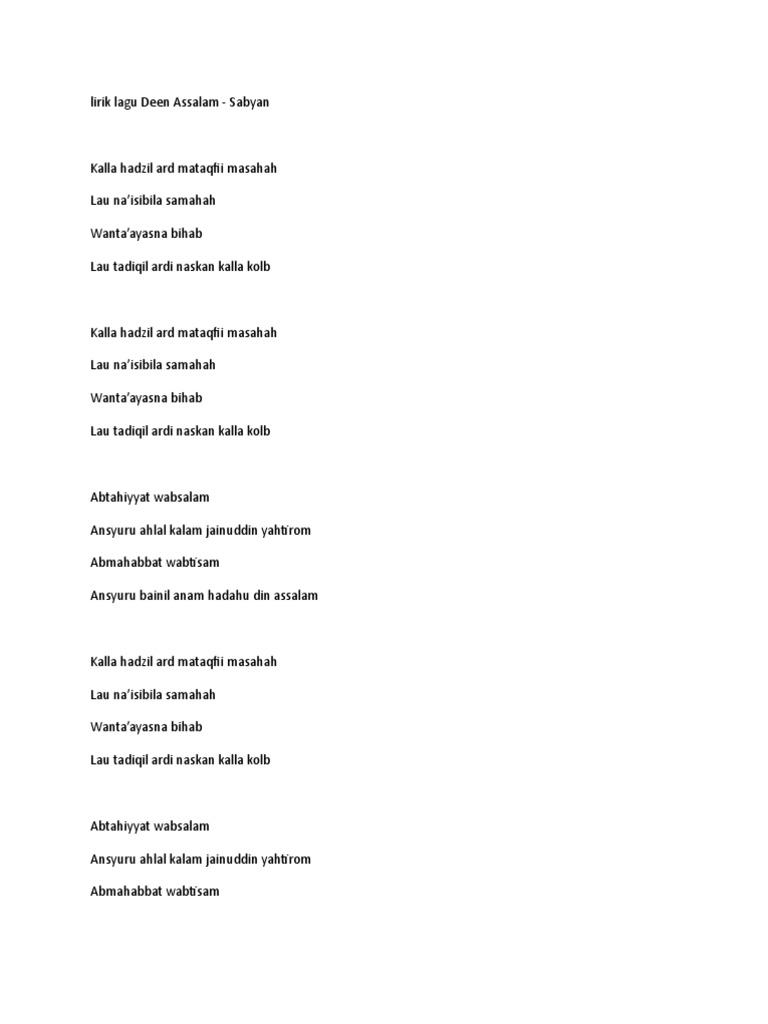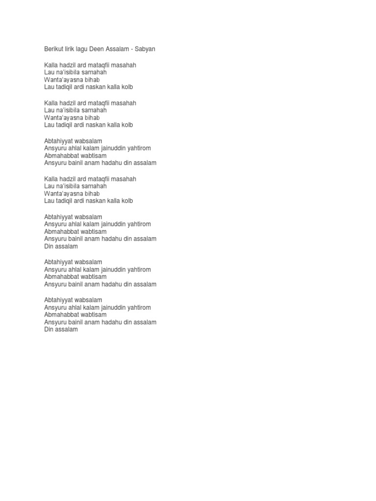 Lirik Deen Assalam di Indonesia dipopulerkan oleh grup band Sabyan Gambus. Nissa Sabyan terhalang kuliah karena langsung terjun ke. Dengan cinta dan senyuman.